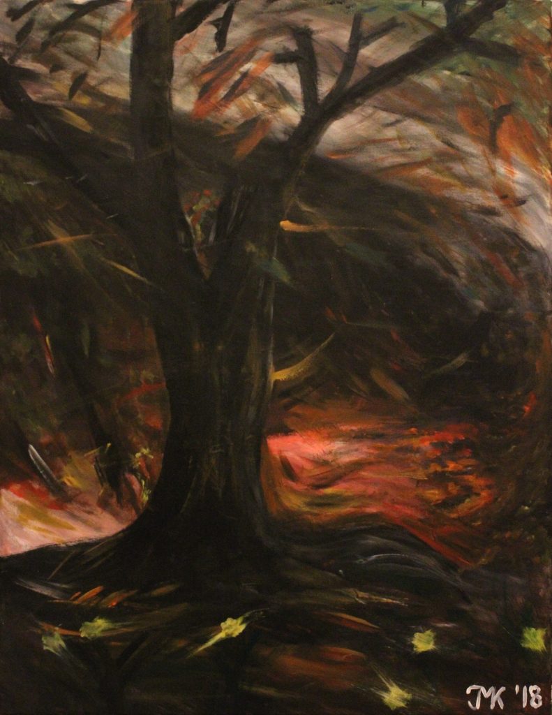 Eines der ersten Werke in diesem Stil ist mein Bild „Herbststurm“ aus dem Jahr 2018. Es weist insbesondere zwei typische Merkmale auf, die auch heute noch regelmäßig in meinen Bildern vorkommen, nämlich ein großes Objekt – in diesem Fall der Baum, welcher umgeben ist von einer unruhigen, dynamischen Strichführung, die möglichst das Auge des Betrachters in ihren Bann zieht und daran hindert zur Ruhe zu kommen.